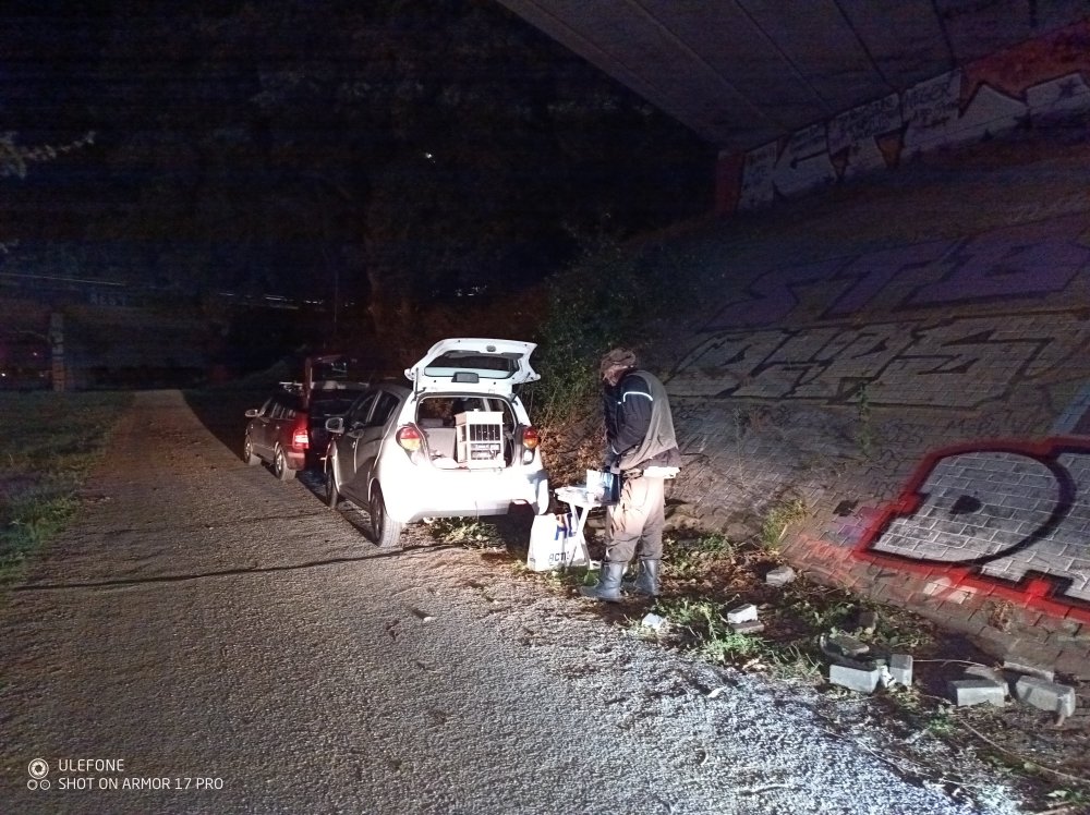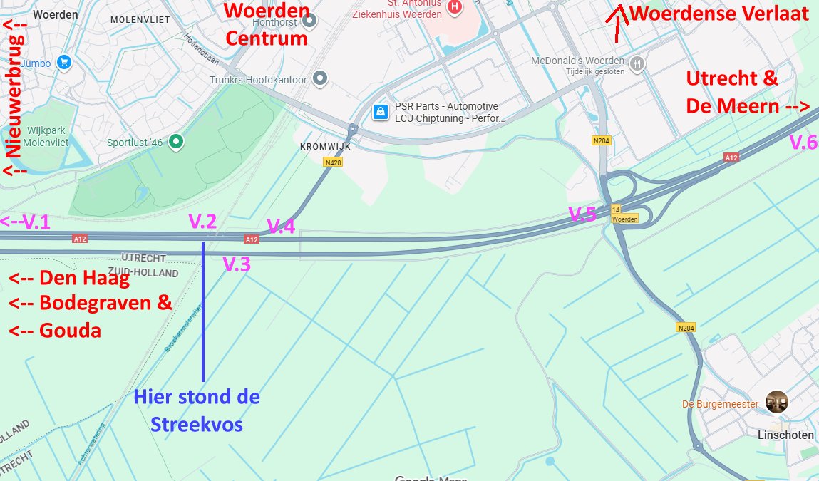 Parallelweg West, Woerden (onder de A12 links v/h het spoor) Soms heb je van die dagen... weekenden... weken dat je even niet lekker in je vel zit, onrustig bent, twijfel zich meester van je maakt en je denkt 'Waar ben ik aan begonnen?' d.w.z. ik heb die dagen... of zoals in dit geval wel eens van die weekenden. Je zou toch zeggen 'Je mag weer een radiovos neer zetten en dat is toch geweldig?'. Ja en dat is ook zo, maar als het weer je op de proef steld omdat je een geweldig mooie en vrij moeilijke vosplek hebt bedacht en het weer totaal niet toe laat dat je deze gebruikt, dan kan dat balen zijn. En als dat weer dan tot het laatste uur voor vertrek naar de radiovosplek twijfel blijft zaaien over wel of geen harde wind en wel of geen harde regen en onweer, dan gaat dat bij mij in mijn brein een eigen leven leiden. En soms zo hevig dat ik er ziek van kan worden... letterlijk! En dat gebeurde deze avond ook. De plek waar ik Rob mee naar toe nam had ik helemaal niet gepland voor vanavond, maar ik kon niet anders dan het zekere voor het onzekere nemen en daarom uit de zuidwester wind en droog gaan staan. Ik wil namelijk niet op mijn geweten hebben dat jullie bij Streekvos Nederland binnen rijden, de autodeur open doet en die meteen uit je handen wordt gerukt en jullie en het interieur van jullie auto drijfnat zijn. Dat was de enige doorslaggevende reden dat we hier stonden deze avond en niet ergens anders... Ik kende deze plek nog van heel lang geleden toen de Haagse Vrijdagavond Vos (HVV) en de Rotterdamse Vos (RdV) hier hun kunsten vertoonden, met uiteenlopende reacties van de deelnemers. Dat was de tijd dat er regelmatig 'slachtoffers' vielen van echte vossenstreken versterkt door het gebrek aan een navigatiesysteem in de voertuigen. Dat was een geweldige tijd... Denkend aan die tijd had ik geen andere overtuiging dan dat het in 2025 met navigatiesystemen en andere inzichten voor de deelnemers geen enkel probleem zou zijn deze plek snel en doeltreffend te vinden. Ik zag het dus niet echt zitten deze avond en besloot elk detail waarmee ik het iets moeilijker kon maken ook tot in de puntjes uit te werken (en Rob was ook vol enthousiasme hierover toen we éénmaal op de plek waren. En dat had op zich al de nodige voeten in de aarde, want wij komen vanuit Amsterdam als wij een radiovos gaan organiseren en alle wegen daar omheen stonden vol met stilstaand verkeerd op 1 na. En Arno v/d Radio zou Arno niet zijn geweest als ik dat ook niet goed onderzocht had vooraf. Rob begreep het niet helemaal geloof ik toen ik zei dat we niet naar de Zeeburgertunnel (Amsterdam Noord / oost) maar naar de Coentunnel (Amsterdam Noord / west) vertrokken. De A9 stond namelijk vol (vanaf knooppunt Raasdorp tot Knooppunt Holendrecht) en de Amsterdamse ring Oost (van Zeeburgertunnel tot knooppunt Amstel) ook. Ik zette in op Coentunnel (ring A10 west) en A5 (richting A4 Schiphol) en dat ging inderdaad file loos goed. Op de A4 bij Schiphol ging ik zuiderlijk richting Leiden en bij Leiden de N11 op en via Alphen aan den Rijn naar de A12 bij Bodegraven. Toen was het alleen nog 3,5 km rechtdoor richting Woerden en bij Nieuwerbrug er af en dan richting Woerden west. En toen begon datgene wat ik niet voorzien had en voor de deelnemers een soort moderne hel bleek te zijn, in het bijzonder voor Mitch uit Hoofddorp die de 1e testvos (die bij die sluis tussen de A2 en Wilnis) nog 1e werd en al heel snel bij ons stond toen... ![]() Bovenstaande schermafdruk van Google Maps laat zien dat het plekje dat ik gekozen had een relatief klein viaduct was onder de autosnelweg A12 bij Woerden west, maar er lagen er nog 5 naast. Ik hoorde later dit weekend dat we ook nog eens keihard waren geweest met ons signaal (o.a. S8/9 op de mobiele spriet op draaipunt Nieuwe Wetering bij Bilthoven langs de A27 en ook S8 basis in Hilversum. En als je zelf niet gereden hebt dan kun je wel indenken hoe het geweest moet zijn als je dan de oorsprong van het signaal zoekt, 100 km/u op de A12 rijd en dan ineens bijna 'volle bak' (meter in de hoek) krijgt om later stilstaand op een afrit en kijkend op je navigatie vast te stellen dat je al 6 (!) viaducten over gereden bent. En niet dat je zegt '6 afritten dus even terug en 1 voor 1 af rijden' maar 6 viaducten, waarvan er 4 vrij lastig te bereiken zijn. Niet alleen omdat het geen afritten zijn (en er maar 1 afrit bij zit) maar ook omdat én de rijbanen gescheiden zijn (dus de vos kan er ook nog tussen in staan) én er nog een parallelweg naast ligt die ook niet alleen maar evenwijdig aan de A12 loopt + een hoogteverschil t.o.v. de hoofdweg kent op de meeste plaatsen. En dan heb ik het nog niet over de wijze waarop je ons - de Streekvos - uitsluitend kon bereiken, want dat was weer een parallelweggetje van de parallelweg en die moest je dan ook nog op door eerst de radiovos 700 meter voorbij te rijden in oostelijke richting (ri. Utrecht) en dan met een sierlijke S-bocht omkeren en omlaag rijden, om vervolgens 2 km terug te rijden in westelijke richting (ri. Den Haag / Bodegraven / Gouda). Dan kwam je 2 kleine viaducten tegen waaronder wij geen van beiden stonden. Desondanks moest je overtuigd zijn van wat je deed en liefst de eerste viaduct (maar de 2e kon ook als je voorzichtig reed) er onderdoor gaan naar de zuidzijde van de A12 en dan weer terug rijden (ongeveer 1 of 1,5 km) in oostelijke richting (ri. Utrecht) over een twijfelachtig op een fietspad lijkend doorlopend oud weggetje naar 'niets'. Het signaal was aan het begin van dit weggetje ongetwijfeld een stuk minder dan op de A12 en aan de andere kant (noordkant) op de parallelweg, maar dit was echt de enige ingang. En pas als je bijna op onze bumper stond, zag je ons pas om de hoek staan. Kortom: Een helse plek om te vinden en dan heb ik de vervelenste nog niet eens genoemd, want het is (natuurlijk) niet alleen aan de andere kant van de snelweg, maar ook altijd aan de overkant. In dit geval betrof dit een spoorlijn met een sloot er naast welke parallelwe