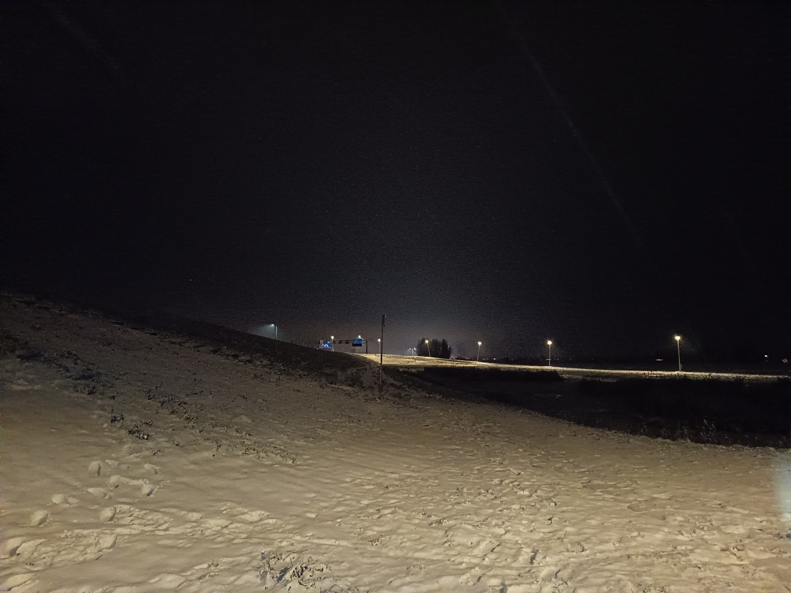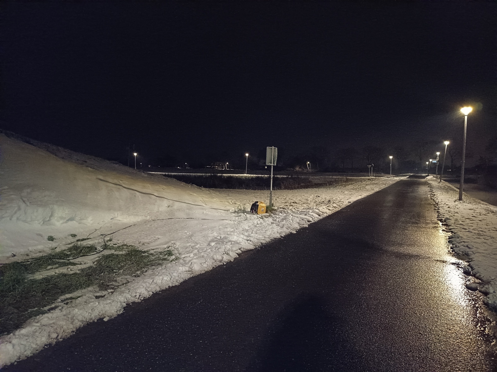 rijden was, dus je moest een aardig stukje van het signaal af rijden. En dat door een pikdonkere polder waarin alles 1 kleur had gekregen door het weer (wit) en alleen dus de weg nog zwart was (want het was prima gestrooid, ook hier).