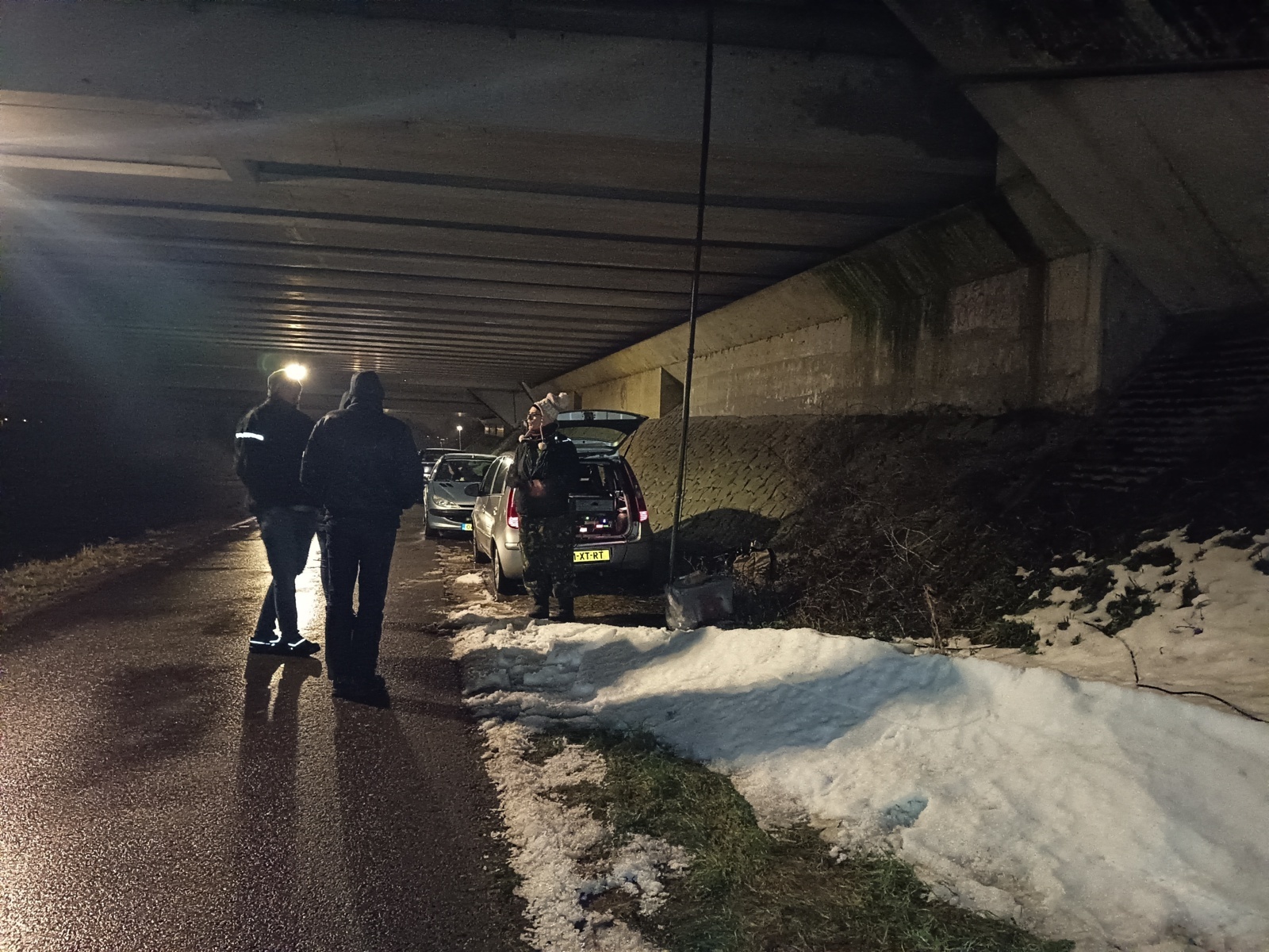 uitgebreid gestrooid en de weg nat maar niet glad. We stapten onder het ruime goed verlichte viaduct uit de auto en keken rond, waarbij ik meteen onder het viaduct vandaan liep en de besneeuwde helling van de dijk waarop de A2 ligt